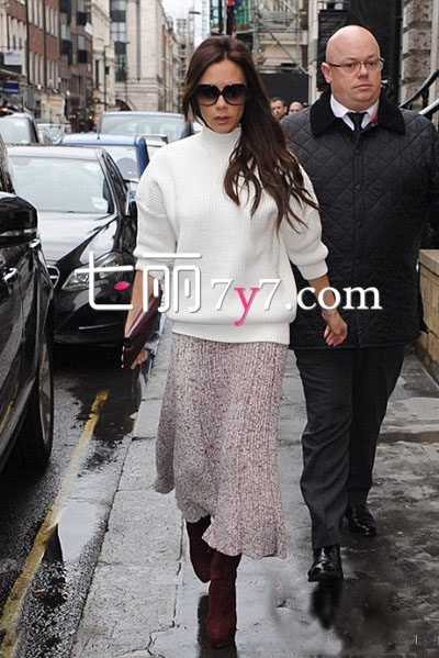 贝嫂的衣品是毋庸置疑的。这身少女装扮减龄且优雅。白色茧型高领毛衣,搭配粉色粗花呢半身长裙,都极具温柔女人味。再配上酒红色高跟及踝短靴和handbag,走在街头好似走T台,太美了。