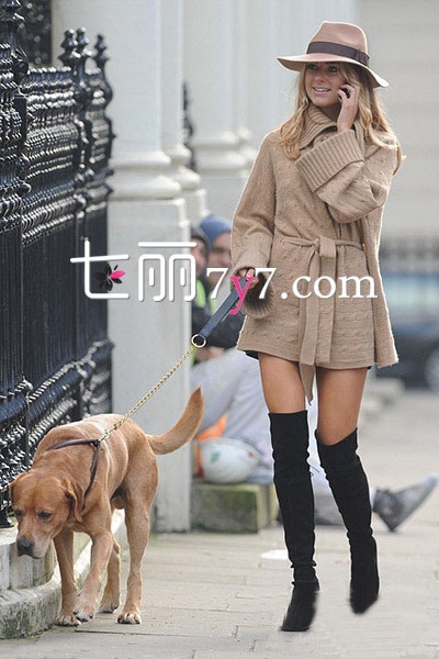 搭配示范:浅驼色宽松收腰长毛衣+黑色过膝靴+浅驼色礼帽