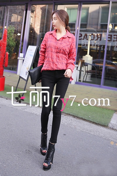 红黑色的格子衬衫,不仅时尚靓丽,更是极具女人味,下穿黑色紧身裤,脚踩一双高跟短靴,在增添了春日活力的同时,还有一股淡淡的干练职场范。