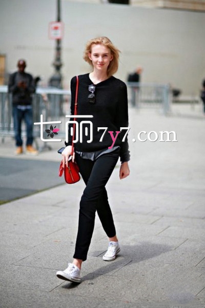 搭配要点:黑色毛衣+黑色紧身裤+白色匡威鞋+红色小挎包