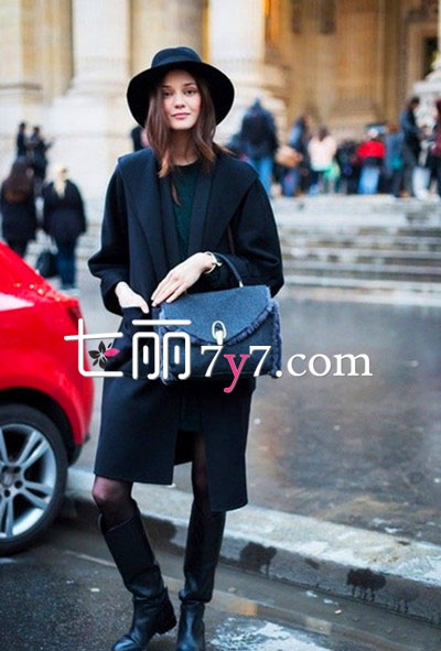 LOOK 5:黑色大衣+墨绿色毛衣+长靴+宽檐帽+手拿包