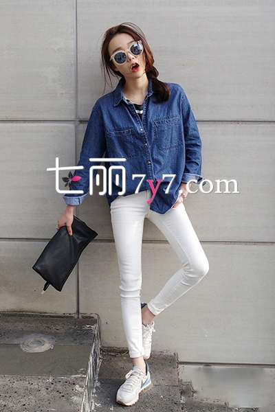 深色仔衬衫外套,尽显时髦休闲范儿,绝对人手必备款单品哦。无论是单穿还是作为外套,都很实用好看,穿出帅气时尚的味道,配白色紧身裤和时尚运动鞋,清新而有活力。黑色手包和黑色墨镜,更添帅气感。