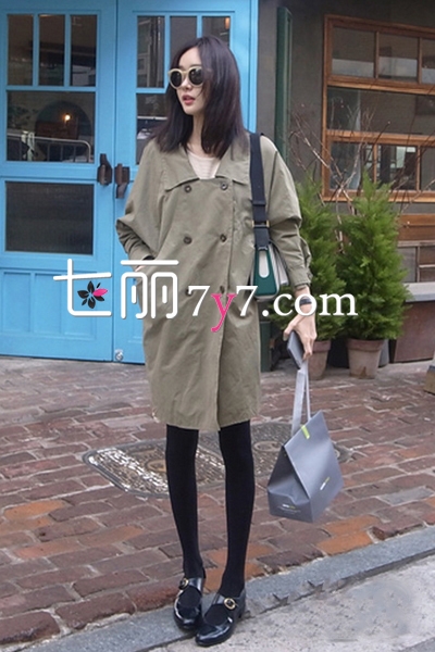 军绿色休闲风衣外套,款式的版型和双排扣设计,穿出时髦感,搭配打底衫和黑色裤袜,上宽下窄的穿搭,显得双腿非常纤细修长,脚踩一双黑色扣带皮鞋,简约帅气又养眼,韩国女孩对军绿色外套绝对是真爱啊。