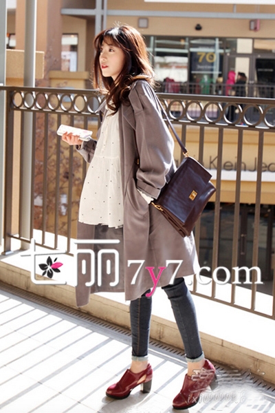 想要穿出早春的时尚优雅魅力,风衣当然是最佳的选择,中长款的韩版风衣,时尚又有范,内搭白色娃娃雪纺纱,下穿紧身牛仔裤,体现出女生清新可爱的气质,脚踩一双红色的高跟鞋,显现出靓丽而个性的一面。