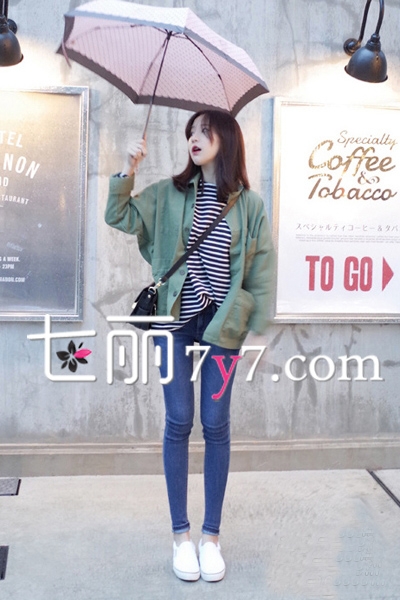 军绿色的休闲外套,也是春日最常见的服饰,蝙蝠袖的设计,穿出了女生时尚而帅气的中性风,内搭经典的条纹衫,下穿紧身牛仔小脚裤,脚踩一双白色的懒人鞋,不仅十分显瘦,舒适度也爆棚,同时穿搭出了典型的韩式街头风格。