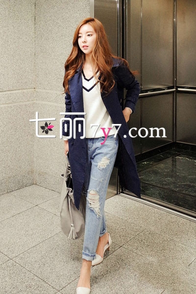 示范搭配:藏蓝色风衣+白色针织衫+破洞仔裤+尖头鞋