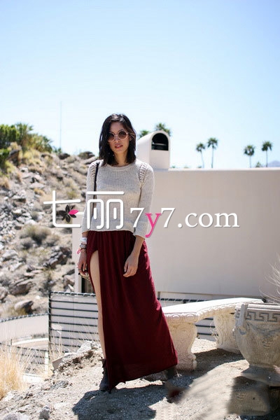 米色套头七分袖毛衣,看似简单却有亮点,肩部的的镂空设计,带有一点小性感,搭配酒红色高开叉长裙和黑色及踝短靴,随风摆动的裙摆时有时无的秀出美腿,既凸显气质又带有随性和性感的气息。