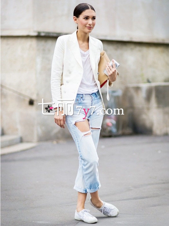 LOOK 5:白色西装+白色T恤+破洞牛仔裤+白色球鞋