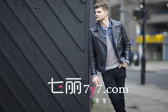 搭配看点:经典清新的型男搭配,一件机车皮衣、牛仔衬衣、针织毛衣和黑色修身长裤就能搞定,毛衣选择灰色系非常淡雅,脚上再来一双经典黑色牛津鞋就完美了。