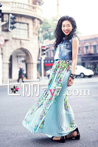 早春牛仔是最时尚流行的单品之一,而百褶长裙则是最显女人味的单品之一,牛仔小背心搭配蓝色的印花百褶裙,裙子十分飘逸且唯美至极,再加上女生的红唇和黑长卷发的点缀,这个春天尽显万种风情。