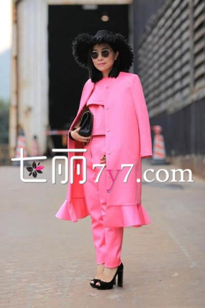 粉色在春天显得格外靓丽抢眼,而这款粉色的套装贵气又可爱,再搭配上黑色的大檐帽感觉就像在度假一般的迷人极了,在披上一个粉色外套,不仅增加了个人气场,更是将完美的粉色搭配进行到到底。
