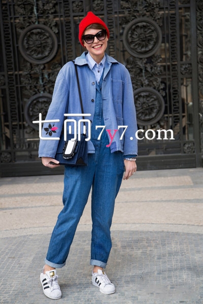 就是这么一身简简单单的仔造型,给人一种特别利落的帅气感,很是养眼耐看。宽松版型短款外套混搭仔背带裤,露出白色衬衣领,层次感穿搭增添亮点,穿上白色球鞋,戴上红色毛线帽,随性自然。