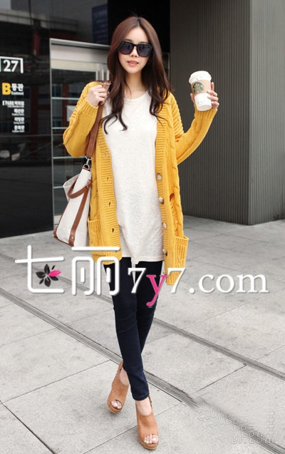 明黄的中长款针织开衫,给人一种十分温暖命明亮的感觉,穿出春日的生机与活力,内搭白色的T恤,简单又时尚,下穿紧身打底裤,轻松显现出女生苗条的好身材,再加上一双鱼嘴高跟鞋的点缀,显高显瘦超迷人。