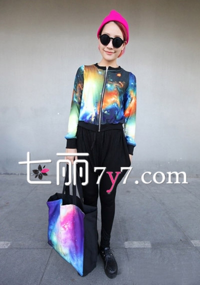 星空可以说是从上一季度延续到这一季的大热元素,短款星空外套搭配黑色的哈伦裤,让女生显得十分俏皮,戴上一顶玫红色的荧光帽子,更显帅气范,而手提的星空包包则与服饰相互呼应,整身炫彩夺目。