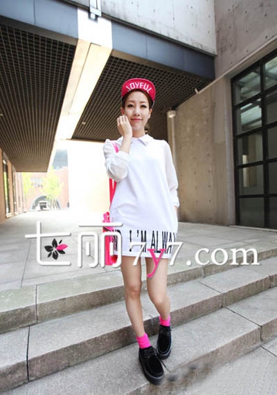 白色的衬衫连衣裙,裙摆处的字母图案瞬间衬托少女帅气有型的气质,拼接的雪纺袖子中和了女性的柔美,再给造型来点颜色则更完美,搭配棒球帽、背包、以及抢镜的袜子,轻松点亮整体造型。