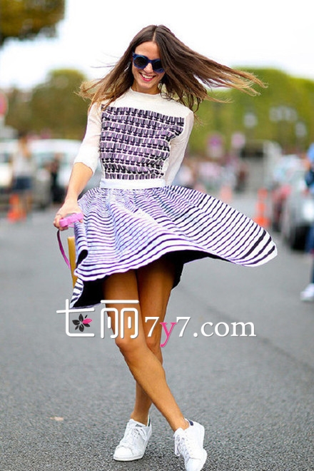 搭配看点:条纹款式长裙,设计上符合了女生可爱、自由的风格,搭配印花T恤,除了色调与长裙呼应外,还具有丝丝休闲范在里面,脚踩运动鞋,很青春洋溢,这样的装扮让人无法抗拒。