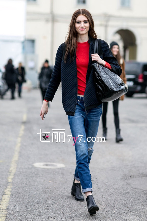 搭配看点:黑色外套搭配红色T恤点亮了装扮色彩,给人眼前一亮的感觉,配上破洞牛仔裤与短皮鞋,休闲舒适却不失时髦感,加上太空包的点缀,渲染了大牌范。