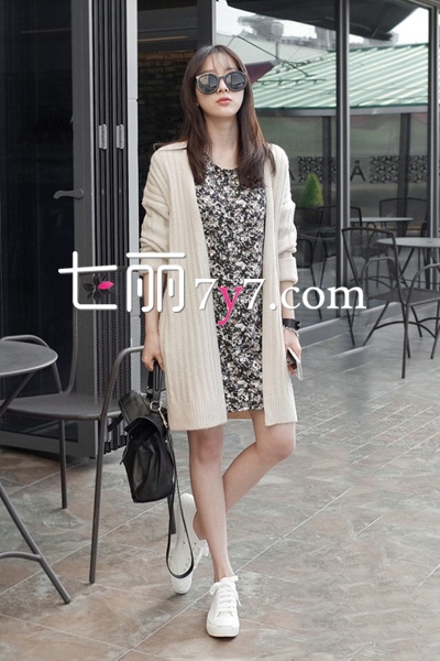 米色针织开衫,颜色较为素雅恬静,非常百搭耐看,完全不用担心会过时哦。内搭深色印花连衣裙,更添文艺气息,简单精致,既有甜美的少女气息,也不失小女人的娇艳。光着双腿脚踩白色运动鞋,很有范儿呢。