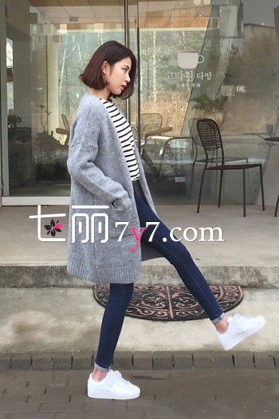 灰色针织开衫中长设计,更显迷人气质,时尚落肩设计,口袋小巧精致,可爱又实用,搭配简约的条纹衫,深色小脚裤,时尚又显瘦,典型韩范儿穿搭。