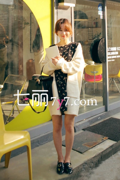 米白色针织开衫清新大方,宽松的中长设计,穿出一股慵懒气息,显得十分诱人,搭配黑色印花连衣裙,黑白配简约清爽,尽显气质。