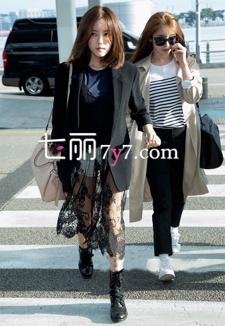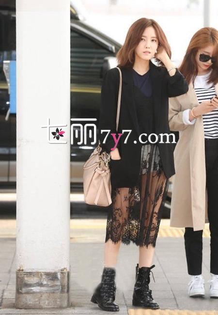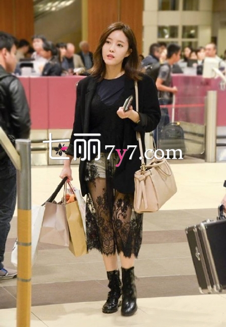 T-ara组合成员朴孝敏两项韩国某机场准备飞往马来西亚,当日,孝敏身穿黑色蕾丝镂空长裙,颇为抢眼。黑色修身小西装外套,经典简约的款式,看起利落沉稳,很显知性气质。内搭藏蓝色上衣和白色热裤,配上一条黑色蕾丝镂空长裙,若隐若现的秀着美腿,性感迷人,脚踩黑色马丁靴,增添帅气感。背上裸粉色单肩包,知性优雅。整个造型采用层叠穿法,非常有型格。