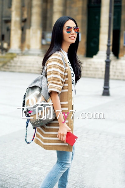 针织开衫是春日的基本单品,姚晨身穿短袖设计额长款针织开衫,下穿经典牛仔裤,背上背一个与针织衫同色系额双肩包,起到相互呼应的效果,整身十分休闲舒适的搭配,再搭配一副眼镜,简单又时髦。