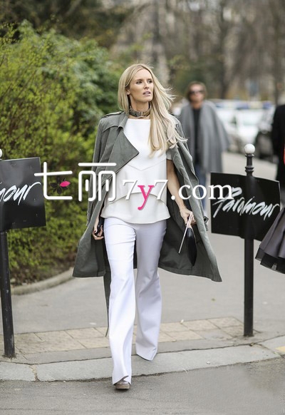 米白色短袖上衣,不规则的拼接设计与飘逸的面料,打造出轻盈的层次感,非常时尚清爽。肩披一件军绿色中长款风衣外套,下穿白色阔腿裤和高跟鞋,轻松拥有大长腿,春日里最时髦的气场女王就是你。