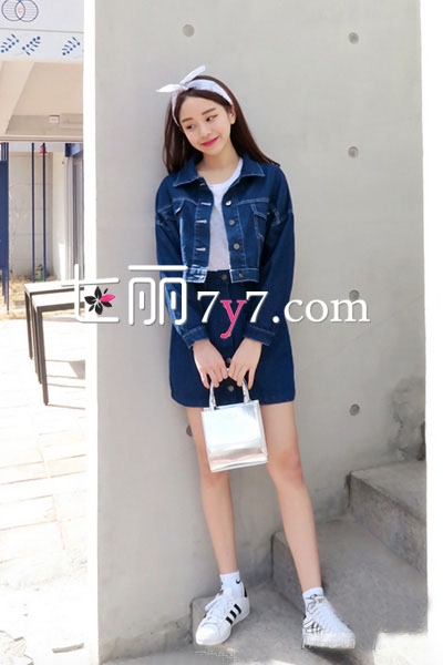 短款的牛仔外套内搭白色打底衫,简约利落范儿下穿同色的仔包臀裙,一排金属钮扣的设计,增添时尚感。秀着美腿,配上白色短袜和运动鞋,丹宁风展现时尚活力。这身装扮是今年非常流行的。