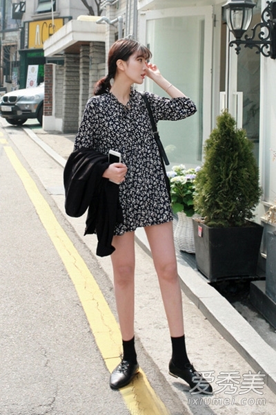 深色碎花连衣裙,虽没有亮色那般抢眼,却也不是甜美清新感,绝对是春季的大热门,简约的宽松版型,看起来非常可爱,搭配黑色短袜和小皮鞋,活力十足。轻松穿出韩系清新浪漫田园风。