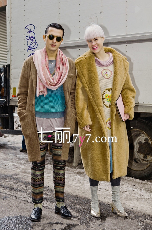 土黄色针织开衫搭配蓝色渐变上衣的 Niels Oostenbrink,加上印花长裤与黑色小皮鞋搭配,潮男风尚十足,女友穿着同色皮草大衣搭配粉色针织连身毛衣,下身穿黑色leggings与金色尖头高跟鞋,尽显潮流感,二人搭配极具特色,堪称一道风景。