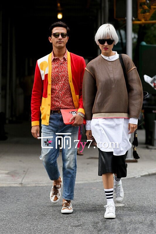 男性以红橘配色针织开衫搭配红色印花衬衣,下身搭配蓝色牛仔长裤。青春有活力,女性穿着褐色透视卫衣搭配白色衬衫,下身身穿黑色皮裙,脚踩白色休闲鞋,搭配黑色条纹袜子,个性十足,潮流前卫。