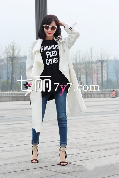 纯白色的风衣给人一种截然不同的感觉,格外优雅大气。内搭黑色的字母上衣,下穿紧身破洞牛仔裤和黑色高跟鞋,戴上一副卡其色的大框墨镜,整套搭配在优雅之上增添了一股摇滚味儿,是街头达人的不错选择哦。