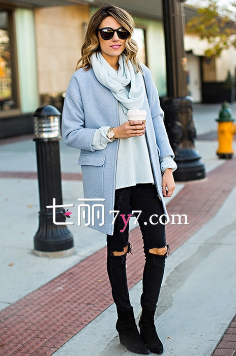搭配看点:中长款大衣非常适合现在春寒天气着装,两边大大口袋的设计点亮大衣的特色感,内搭浅绿色针织,清新迷人,下穿黑色破洞裤,瞬间充满了时尚潮流范,配黑色鞋子与围巾装点,这样的穿搭个性不是国际范哦。