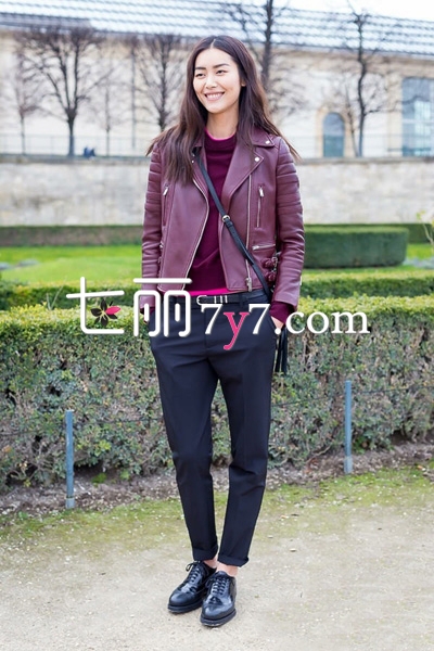 酒红色机车风皮衣外套,内敛知性还带有一丝酷感。经典简约的款式,利用金属拉链等细节设计来增添个性,这种颜色典雅复古,越来越有气质,配同色系的内搭,下面配黑色宽松长裤,尽显干练率性。