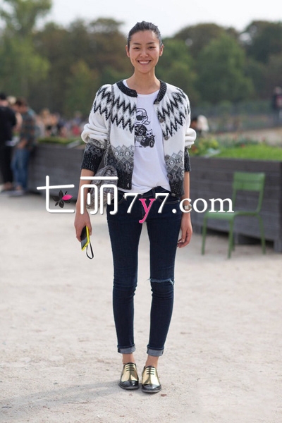 穿搭较为随性的刘雯,却总在细节处理上给人惊艳的感觉。黑白色调的组合,自然又大方,印花针织开衫外套,内搭白色卡通T恤,非常减龄俏皮。下面配上一条深色紧身仔裤和金属色皮鞋,穿出潮范儿。