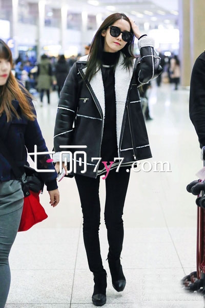 忽冷忽热的春天,为了抵御寒冷,允儿身身穿黑色羊羔毛外套,采用黑色皮革材质,帅气而时髦,春天的天气变化多端,这款厚实的外套遮风挡雨,非常实用,配黑色小脚裤很显瘦。