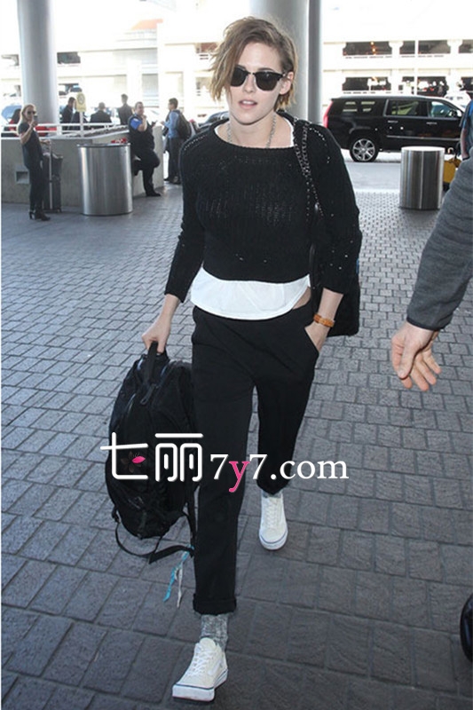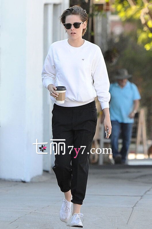 搭配看点:克里斯汀-斯图尔特身穿白色套头卫衣搭配黑色卷边休闲裤,再配上脚踩白色帆布鞋,十足的街头休闲感,加上一头率性的短发搭配大墨镜,帅气感十足。