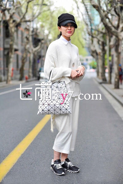 何穗最新街拍,灰色毛衣+墨绿色光泽感半裙,文艺慵懒,少女感十足。马海毛毛衣来自H&M,手提包和粉色毛拖鞋均来自Gucci,半裙来自Tibi 2016