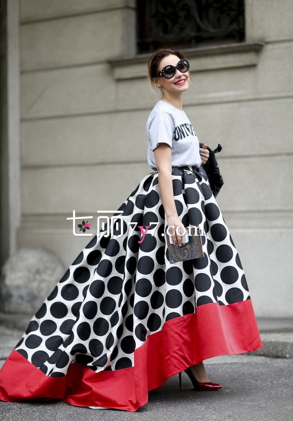 搭配看点:大大的黑色波点蓬蓬裙,不仅让人眼前一亮,彰显出来的大气势不可挡,裙尾利用红色拼接以及长尾裙的设计,让这条裙子充满高贵范,搭配灰色T恤,简约却一点也不失整体大气的装扮,这样的穿搭定会迷倒众人。
