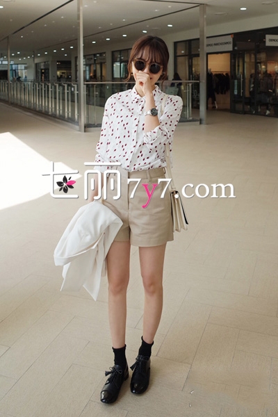 白底红花衬衫,款式简洁大方,红色小碎花图案柔美娇俏,上身效果清新显瘦,搭配卡其色高腰短裤,把衬衫扎进裤中,打造完美的身材比例,配上黑色平底鞋和短袜,利落精神还显瘦。背上白色单肩包,清爽极了。