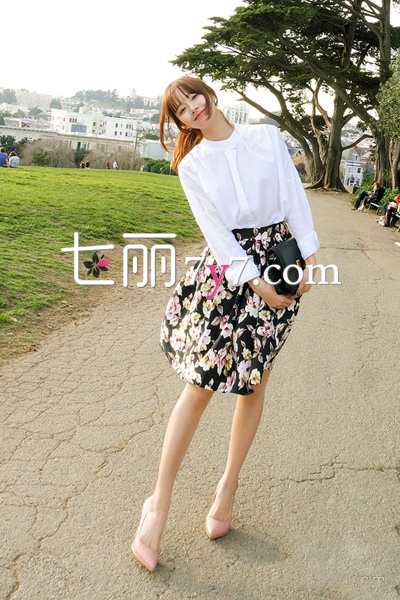 简约的白色衬衫,时尚的圆领设计,散发着淡淡的复古气息,宽松的版型显得那么随性自然。搭配精致浪漫的印花半身裙,既有名媛气质,又不失文艺范儿,配上粉色尖头高跟鞋和黑色手拿包,很美的装扮。