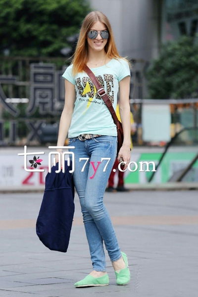 浅绿色T恤配小脚牛仔裤,最为常见的经典搭配,简约清新,彰显年轻活力,绿色鞋子很抢镜,增添时尚和清新感。