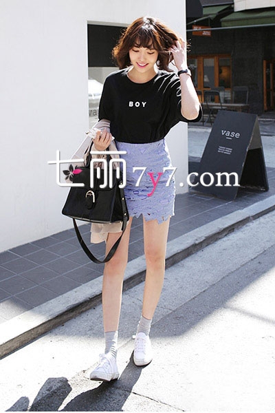 黑色短袖T恤款式简单百搭,最重要的还是很显瘦,不管搭配什么颜色服饰都很美。这位MM选择搭配浅紫色高腰蕾丝包臀裙,打造完美的身材比例。配上浅灰色短袜和白色球鞋,时髦有型。