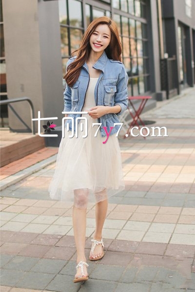 这款浅蓝色仔外套很有特点,松紧束腰设计,增添不少女人味。内搭白色网纱连衣裙,很是唯美浪漫,还带有些许文艺气息。配上一双凉鞋,秀出纤细的小腿,整个人仙气十足。