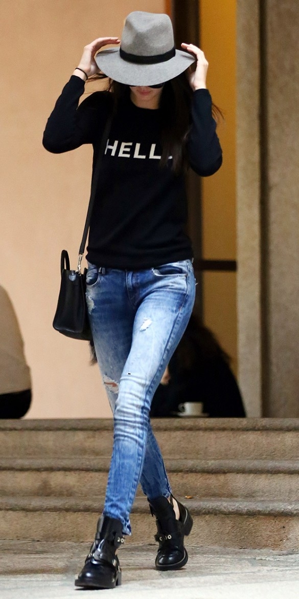 搭配看点:黑色T恤搭配蓝色破洞牛仔裤,十分的简约的搭配,不过脚上霸气十足的马丁靴却让造型吸睛指数直线上升,再搭配一顶礼帽和墨镜,分分钟显示出高逼格。