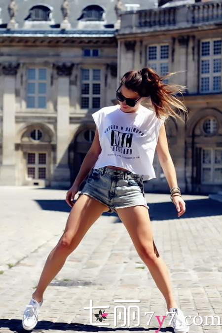 时尚看点:牛仔短裤搭配短top很有美式街头范哦,再搭配一双白色帆布鞋,休闲又不失时尚感,同时还能与白T色彩呼应,时尚就是这么毫不费力哦。