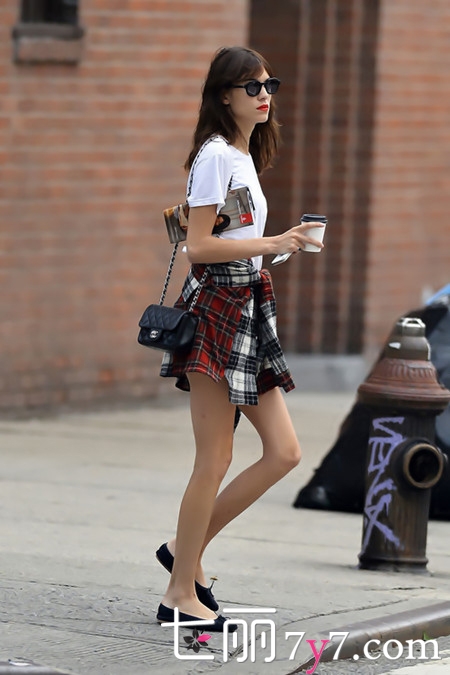 时尚看点:觉得短裤搭白T太单调?那就拿出你的格子衫、牛仔衫、雪纺衫或任何一件衬衫,将它系在腰上吧,丰富造型色彩和层次感,凹造型就是这么容易哦。配饰选择mini黑色链条包、黑色平底鞋和一款摩登气息十足的墨镜,让你轻松成为路人焦点。