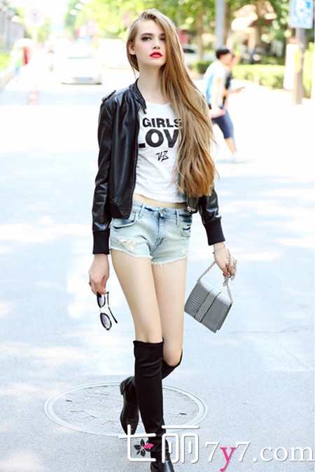 Style 3:字母T+牛仔短裤+皮衣+及膝靴