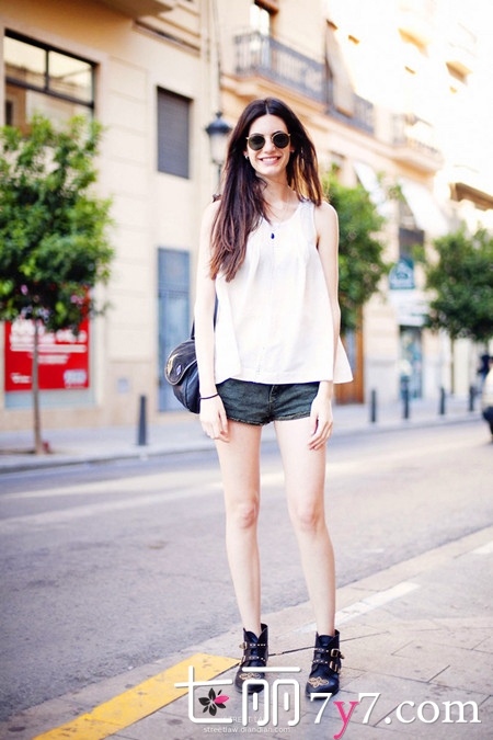 时尚看点:清凉夏日,牛仔短裤搭配什么上衣最酷?当然是性感的吊带背心,宽松的款式更加舒适和拉风。鞋子选择一双极具设计感的黑色踝靴,十足欧美范哦。