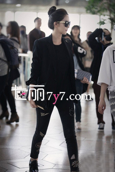 林允儿身穿黑色小西装,内搭黑色T恤,下穿黑色牛仔裤,演绎出了不同于往日的成熟和干练,袖子采用皮质拼接,显得比较有设计感,裤子上的镂空花纹精致个性,彰显潮范儿。